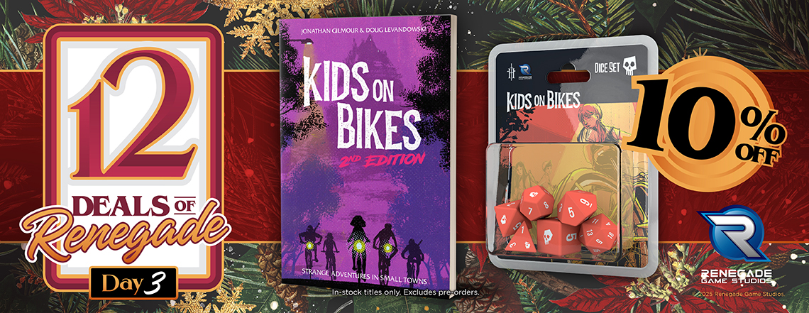 The third Deal of Renegade brings with it the opportunity for strange adventures in small towns! Save 10% on Kids on Bikes 2nd Edition and on the Kids on Bikes Dice Set! Read on to learn more!
