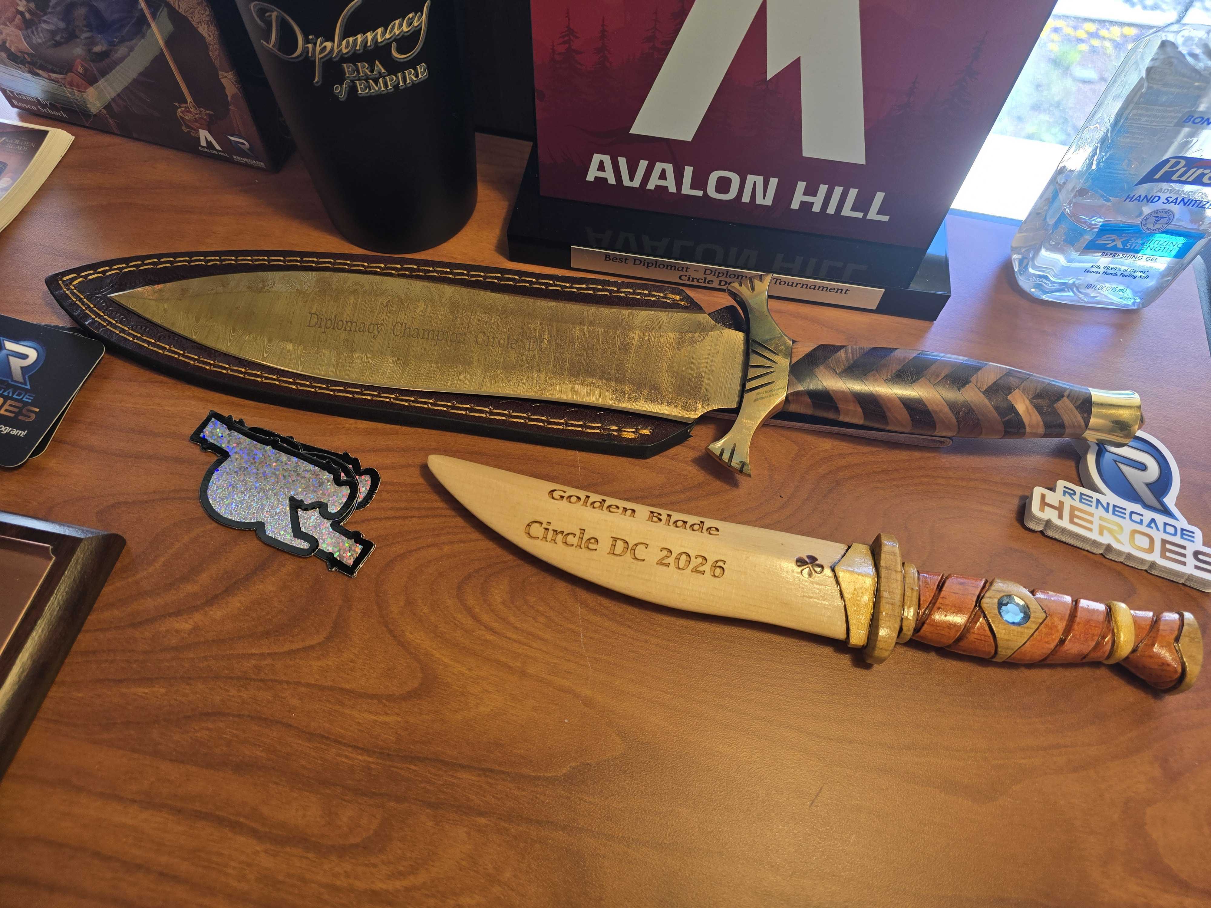 The podium (top 3) finishers received a Diplomacy hat. We awarded Blake Hakimian the coveted “Best Diplomat” award for his performance throughout the event. He participated in the teaching round, helped adjudicate the Era of Empire round, switched into new themed hats every day, and was an absolute pleasure to be around (as noted by many other players). Designer Rosco Schock received the honorary “Golden Blade” award, a carved wooden blade, as thanks for his volunteer work throughout the convention. Kevin Fernandez, DC native, finished the tournament in 4th place and took home the “Best Propagandist” award. Kevin fought through attacks in each of his games and managed to pull a rabbit out of his hat in each game, picking up solid placement scores to claim 4th. Brothers Andrew and Gavin Burnard finished 4th (tied) and 6th place in their first ever tournament. To round out our top board, former World Boardgaming Championships Diplomacy winner Keith Boone finished 7th. Each of the top seven finishers received a copy of The Golden Blade card game.