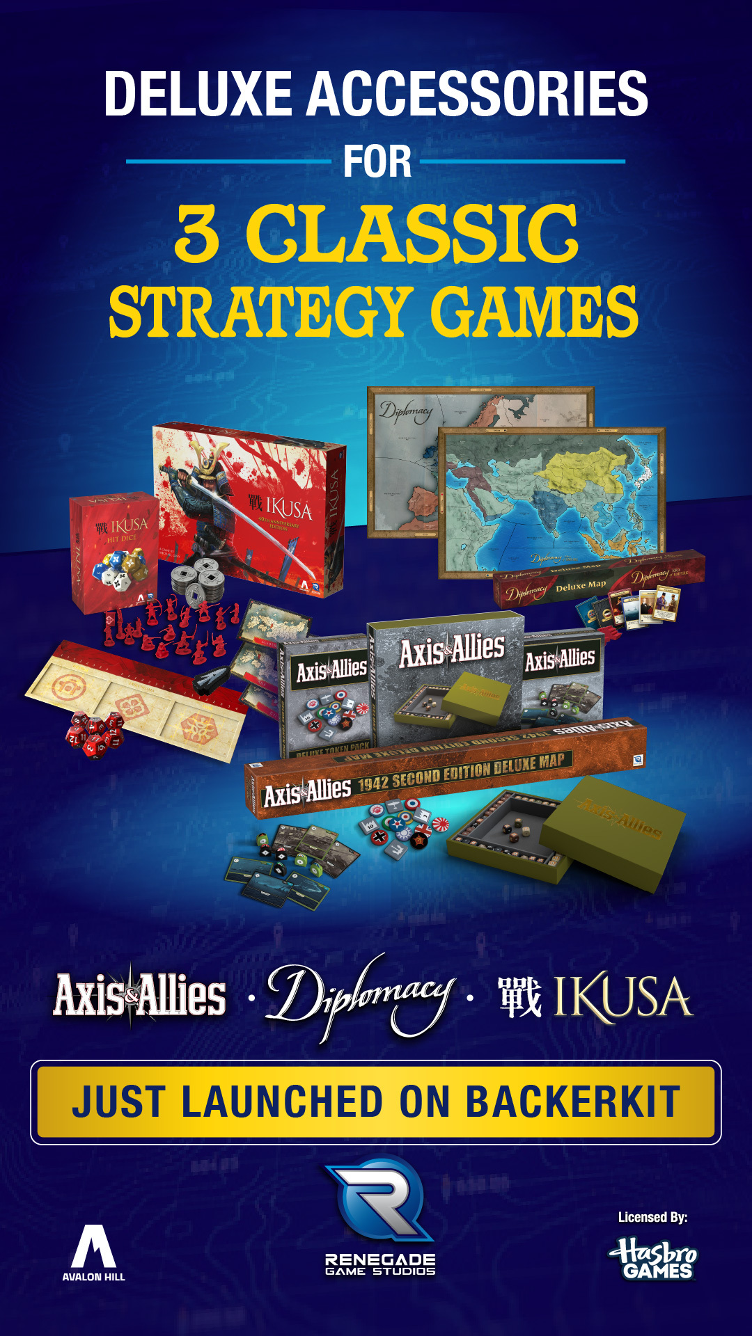 Level up your strategy with our Axis & Allies, Diplomacy, & Ikusa Accessories Campaign. With accessories for some of the most loved strategy games there's something for everyone!