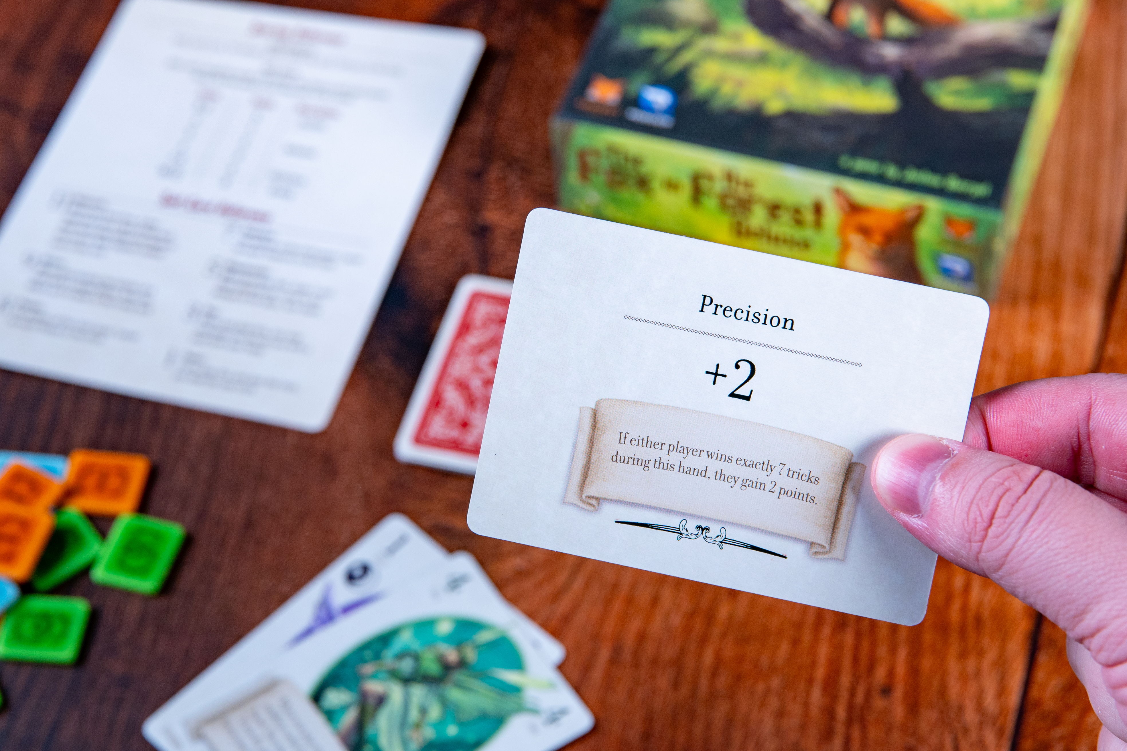 The new release, available now, is a Deluxe Edition of the original The Fox in the Forest. It includes all-new illustrations, foil-stamped cards, and acrylic point tokens. There are also three new gameplay modules adding twists! Players can use one or all when playing, adding lots of variety.