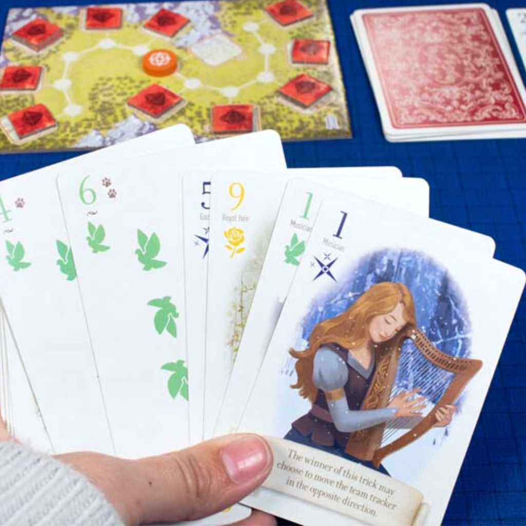 And while you would think the goal is to win every trick, there is actually a unique balancing mechanic in this game. While you can score points by winning tricks, if you get too greedy and win too many hands, you will actually lose points at the end of the round. After all, the villains in fairy tales who get too greedy always fall.