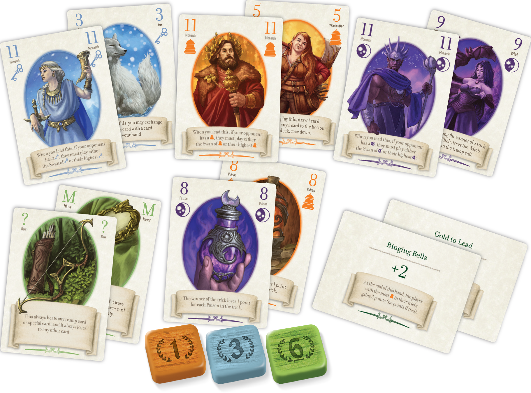 Fairy Tales come to life in this deluxe version of the beloved trick-taking game. Use special abilities to change the trump suit, lead even after losing a trick, and more. Aim for the majority of tricks each hand, but don’t get greedy! If you win too many, you will fall like the villain in so many fairy tales. This deluxe edition includes three all-new modules: special cards, goal cards, and poison cards! Features new illustrations, foil stamping, and acrylic tokens.